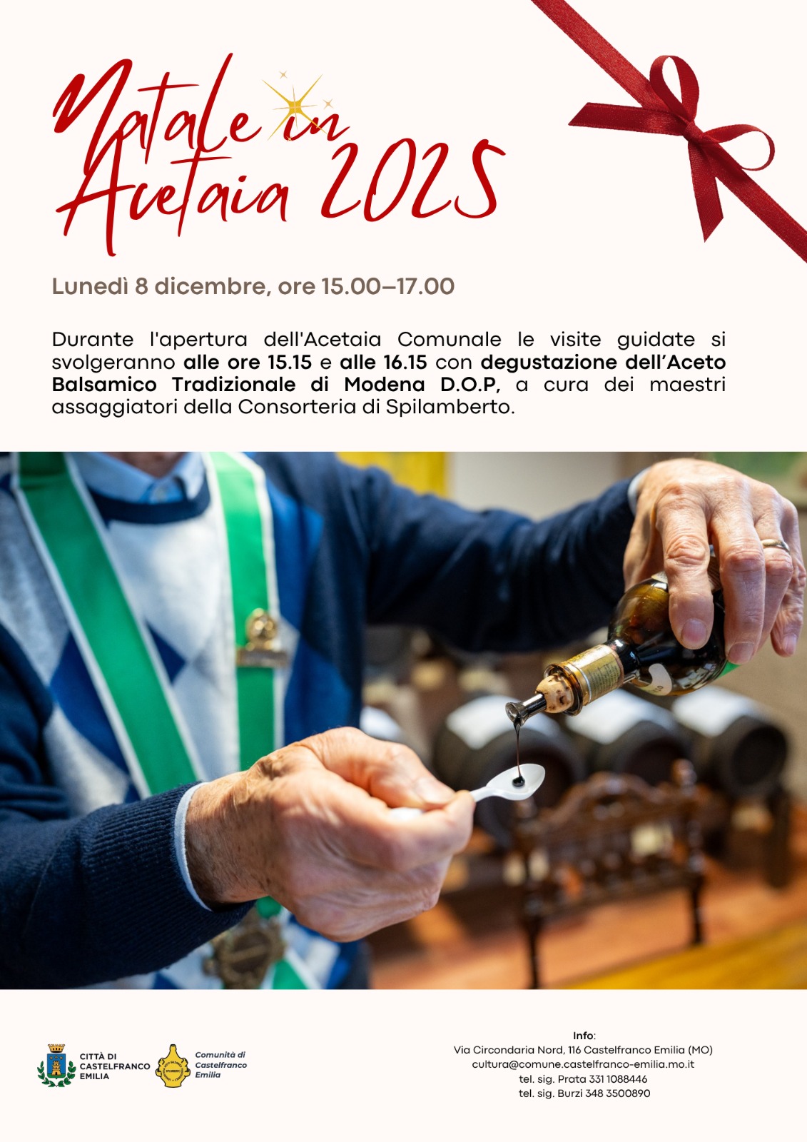 Lunedì 8 Dicembre si terrà un'apertura straordinaria dell'Acetaia Comunale dalle ore 15.00 alle 17.00.